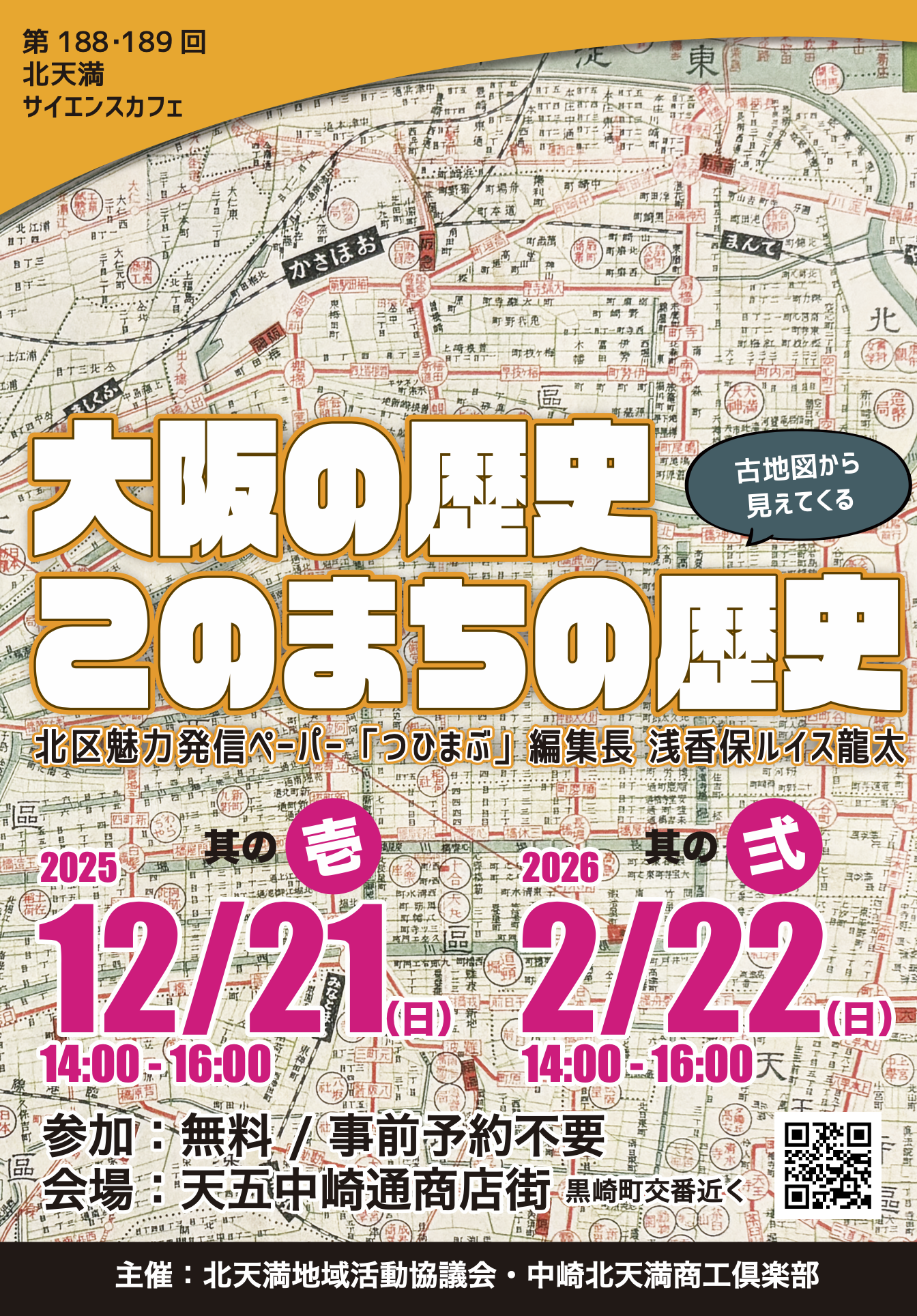 今回の北天満サイエンスカフェは、北区の魅力を深掘りして伝える北区魅力発信フリーペーパー「つひまぶ」編集長の浅香保ルイス龍太さん。